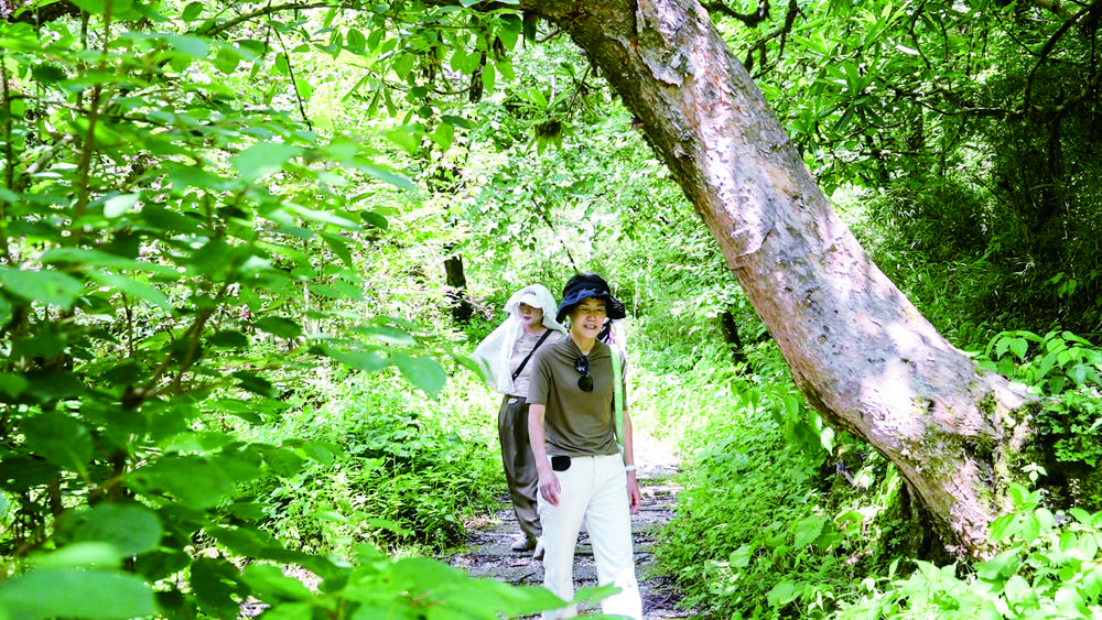 去党岭,目的地自然是密林深处的葫芦海。碧蓝的湖水在四周苍翠的原始森林环抱下更显幽深静美,不断吸引着一波又一波的徒步者前来一睹真容。