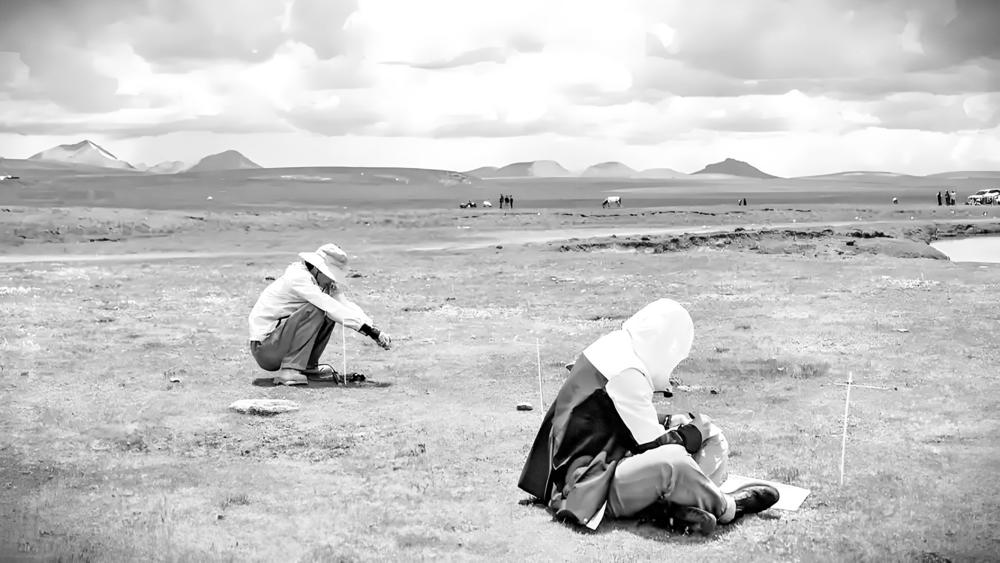 在查旦湿地,科考队员圈出一个1平方米的正方形草地样方,以样方为中心,向东西南北四个方向延伸,每隔2米设置一个监测点,再将土壤综合传感器插入监测点,监测仪上就会显示出土壤的实时温度和湿度。科考人员还用铲子取出一块含根系和植被的泥土,记录有机质层的厚度,进一步研究植被和土壤湿度、冻土退化之间的协同变化关系。