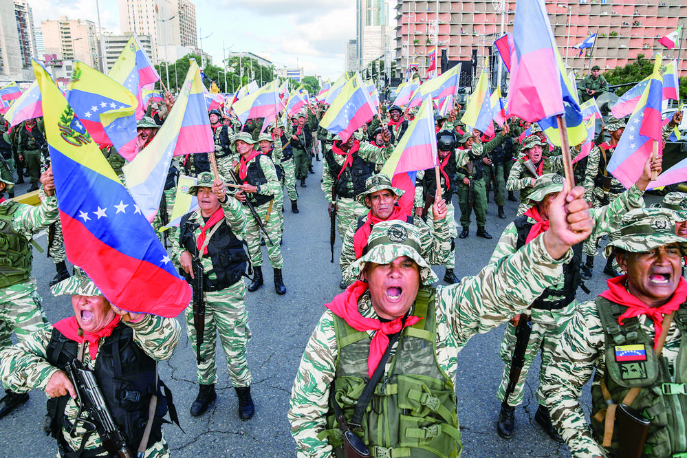 9月23日,在委内瑞拉首都加拉加斯,民兵组织成员挥舞委内瑞拉国旗参加游行。 当天,加拉加斯举行大规模游行,呼吁保卫委内瑞拉主权与和平,反对美国在加勒比海域的军事威胁。 新华社 发(马科斯·萨尔加多 摄)