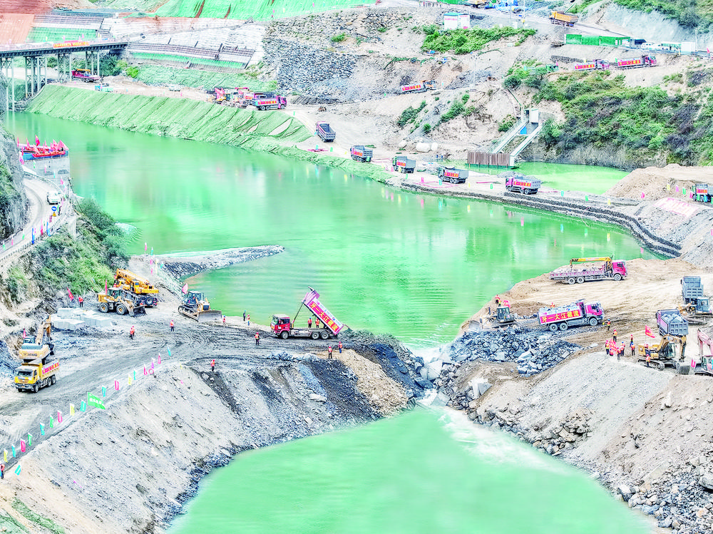 在截流施工中,工程人员创新采用“丁字坝进占挑流”等工法,将导流洞分流比从50%提升至90%以上,两座电站共抛填石料约9万立方米,确保了截流作业安全高效完成。