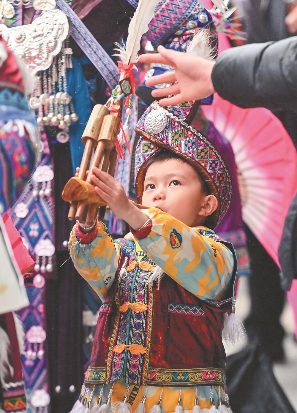 3月8日,小朋友在广西柳州市融水苗族自治县风情苗乡景区举行的坡会上吹芦笙。