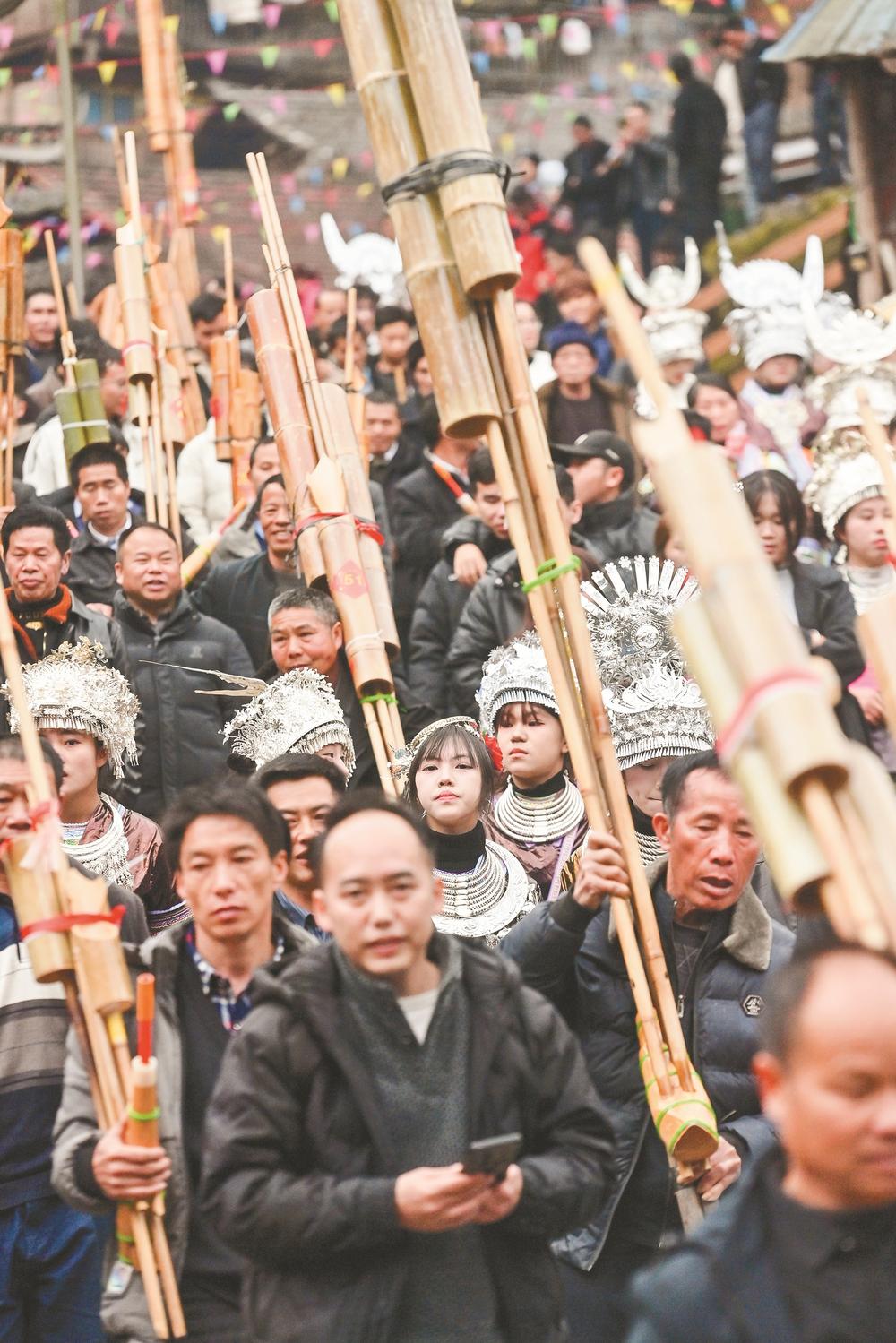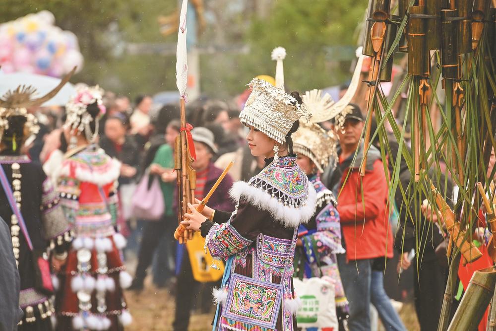3月7日,在广西柳州市融水苗族自治县梦呜苗寨“粤桂协作剧场”,苗族群众在合奏芦笙。