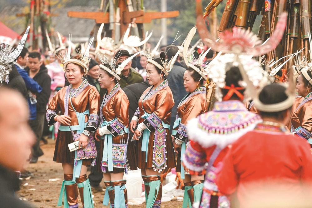 3月4日,苗族妇女参加广西柳州市融水苗族自治县香粉乡古龙坡坡会。