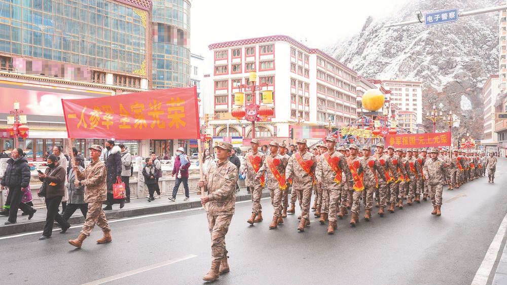 上午8时许,在骑警护航与激昂锣鼓的伴奏下,肩披“一人参军 全家光荣”绶带的新兵队伍迈着铿锵有力的步伐,踏雪启程,沿康定市沿河东路整齐巡游至情歌广场。一路风雪,一路牵挂。“好样的!年轻人,好好干,为家乡争光!”沿途群众自发夹道欢送,掌声、欢呼声此起彼伏,处处洋溢着尊崇军人、支持国防的浓厚氛围。