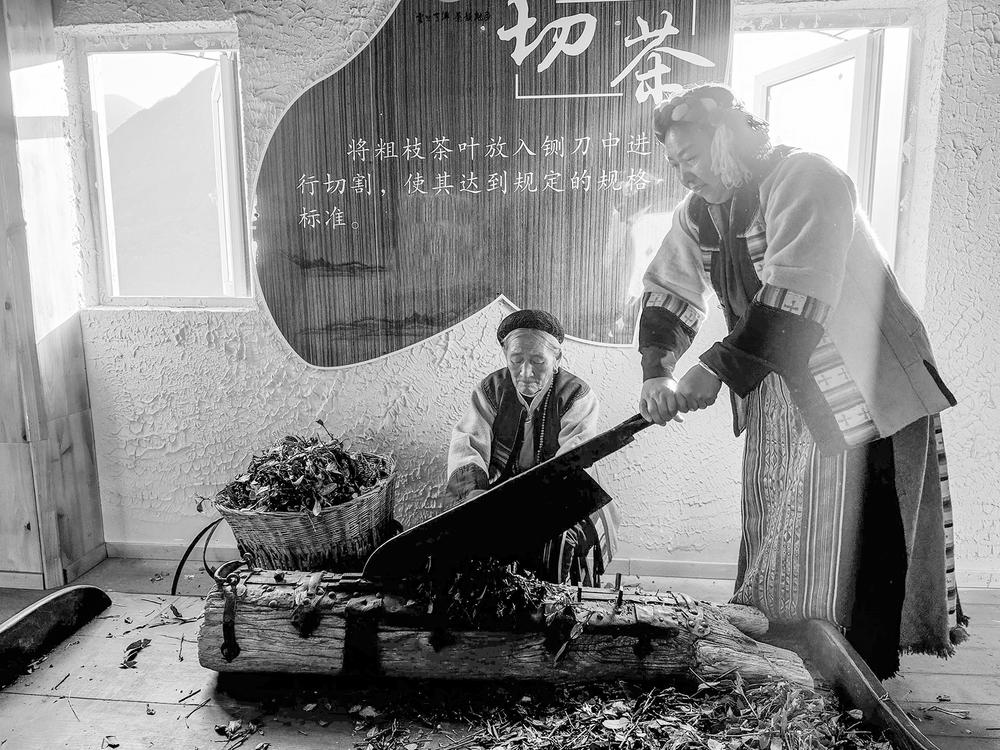 走进工坊,一股清新的茶香扑鼻而来。汪大香的奶奶——年过七旬的老茶人端坐在茶案前,将晾好的茶叶细细切碎,动作娴熟而沉稳,每一刀的力度与分寸都来自几十年的经验积累。一旁的灶台上,熬煮的茶汤正咕嘟作响,醇厚的茶香随着热气弥漫开来,为工坊增添了几分温暖的烟火气息。汪大香则向游客展示着熟茶工序,汁液渗出,茶香愈发浓郁。