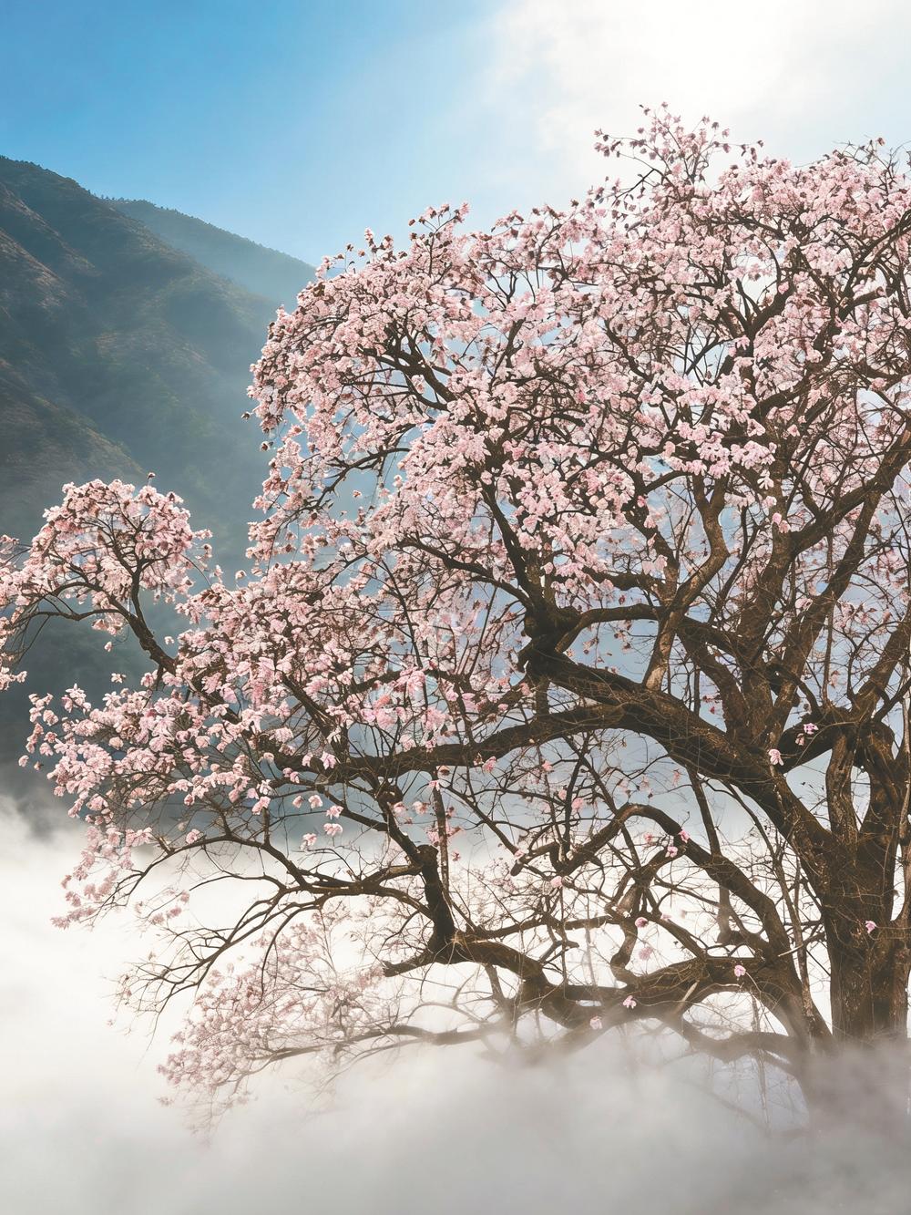 再看那树干,粗壮得令人咋舌,需五六个成年人手拉手才能勉强围抱住。皲裂的树皮刻满岁月的纹路,似老人布满皱纹的手掌,却依旧苍劲挺拔,撑起一片繁花似锦。树旁还有一株稍小的木兰,两树相依,繁花次第绽放,姹紫嫣红,恰似朝霞漫卷,与远处的雪山相映,与周遭的林海相融,美轮美奂,构成一幅错落有致的春日画卷,让人看得眼睛都挪不开,只剩满心的惊叹与欢喜。