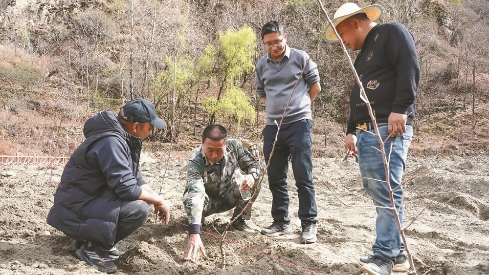 游学珍口中的外地专家,包括来自山西省大宁县的苹果技术专家李新田。今年3月9日,带着山西大宁县苹果种植的成熟经验和先进技术,李新田不远千里来到丹巴县,没有片刻休息,便直奔甲居镇聂拉村等“美人脆”苹果种植基地,深入田间地头,为村民们“把脉问诊”,针对性解决种植过程中遇到的“苦痘病”等技术难题。