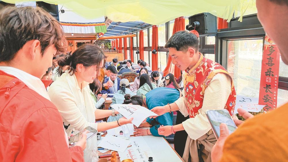 最热闹的是非遗体验。这边,在四川省藏文学校“小老师”的指导下,藏纸拓印的木版上,风马图案渐渐清晰;那边,“一撇藏文,原来这么温柔”,一名女生接过格桑花做成的代表友谊和祝福的种子纸书写的藏文书法作品,轻声说道。而后,打酥油茶的长桶里,汉藏少年的手臂交替用力,茶汤与酥油上下撞击,茶香弥漫。